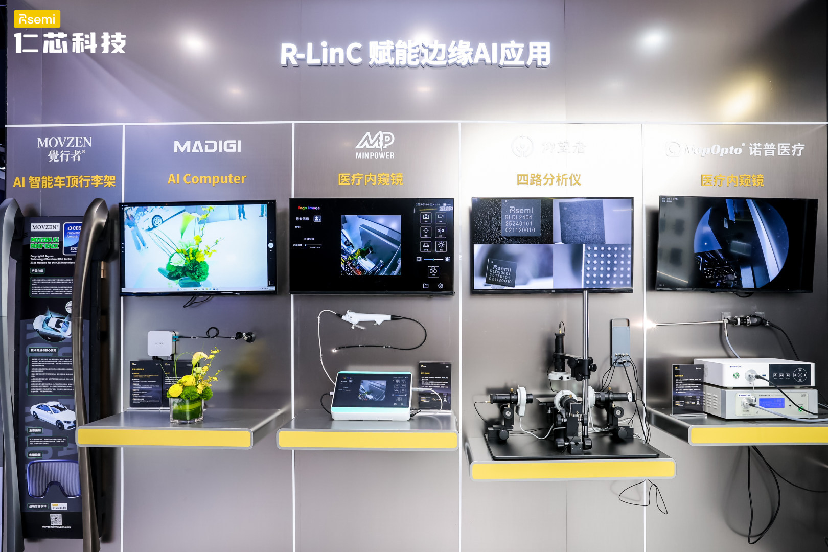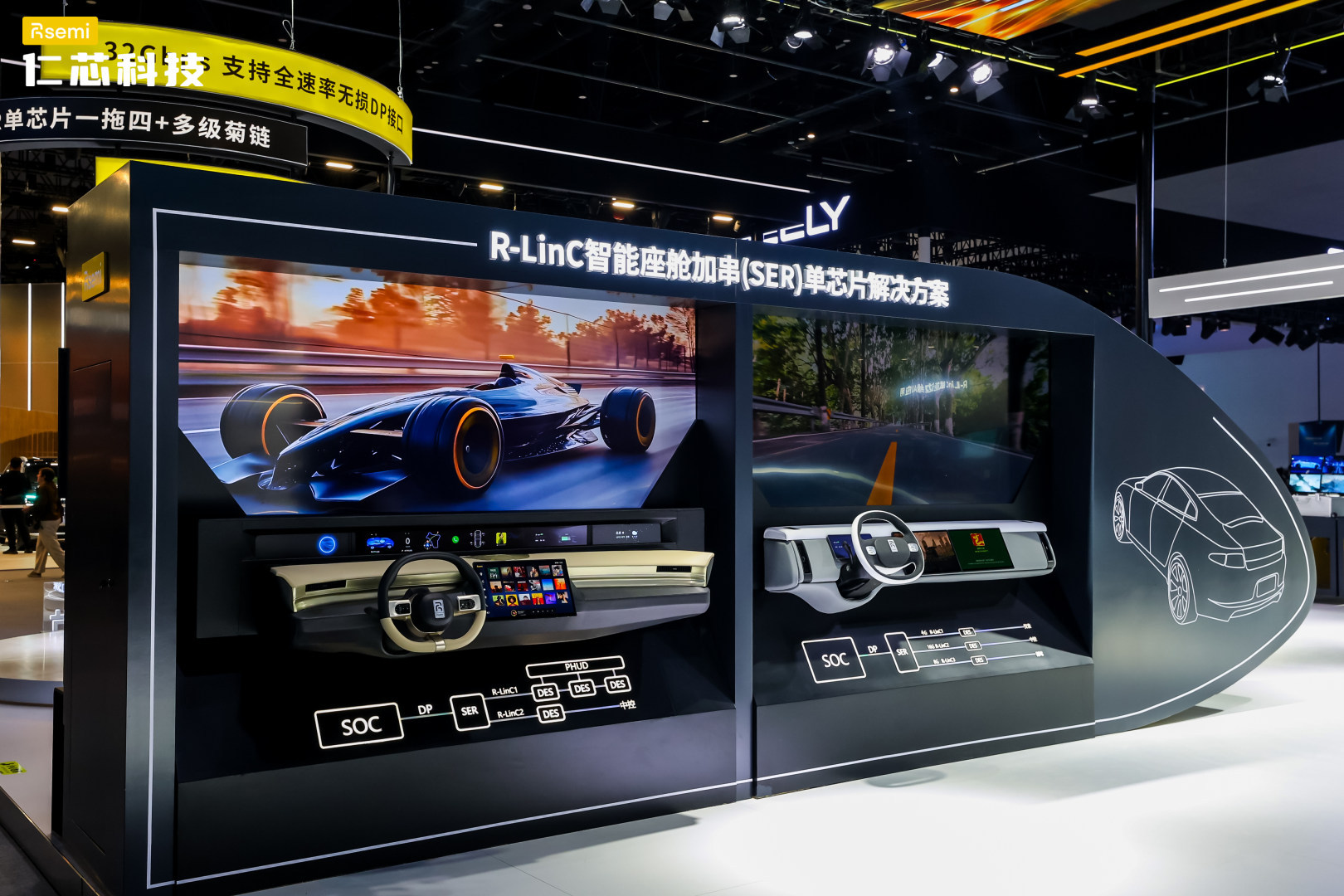 仁芯科技还展示了面向智驾与座舱的 R-LinC方案产品矩阵,涵盖智能座舱组网、舱驾融合、行泊一体以及长距离传输等多个应用场景。
